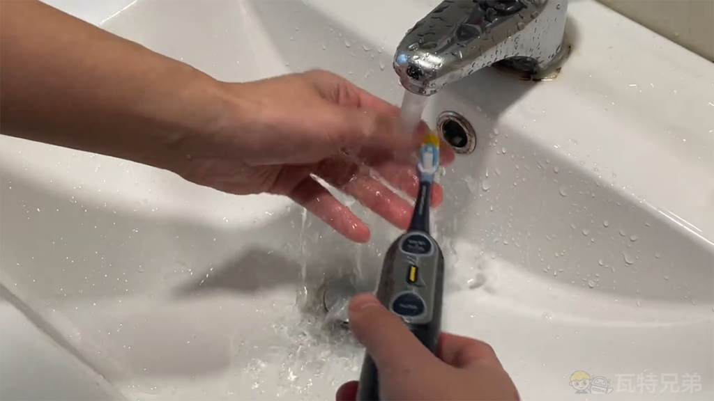 在沖洗測試中,瓦特會模擬日常中最容易接觸的「沖洗」來進行測試,會將電動牙刷於水龍頭下進行約 15 秒沖洗,包含牙刷頭、握柄皆會用水沖刷,並檢測後續是否能正常開啟、功能是否受影響。