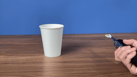 ▼ 高壓水柱,其水壓強度足以沖倒空的紙杯,清洗力道強,但放在口腔內卻不會有不適感