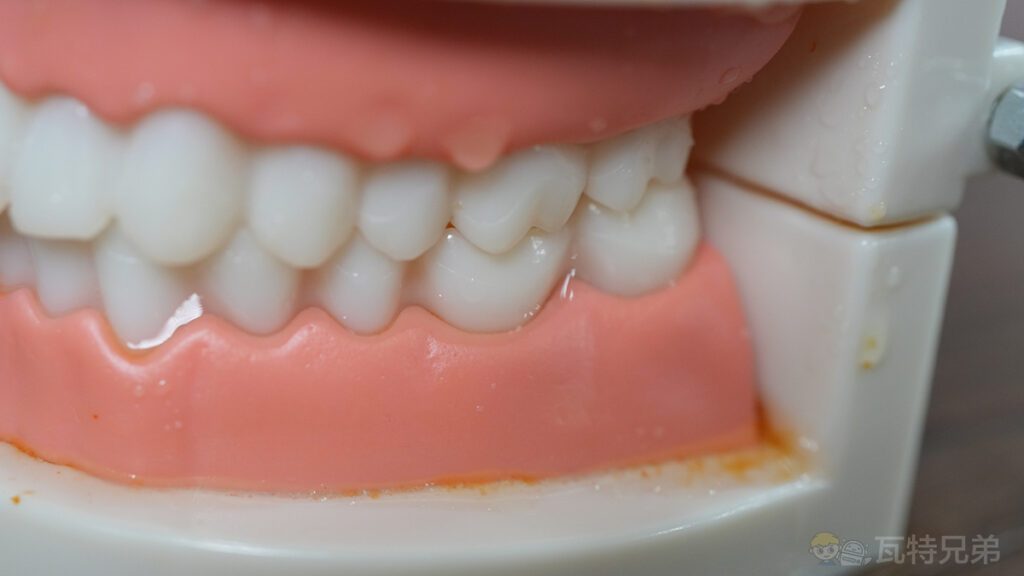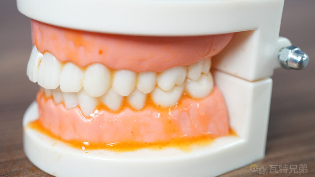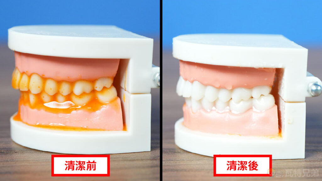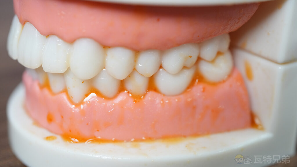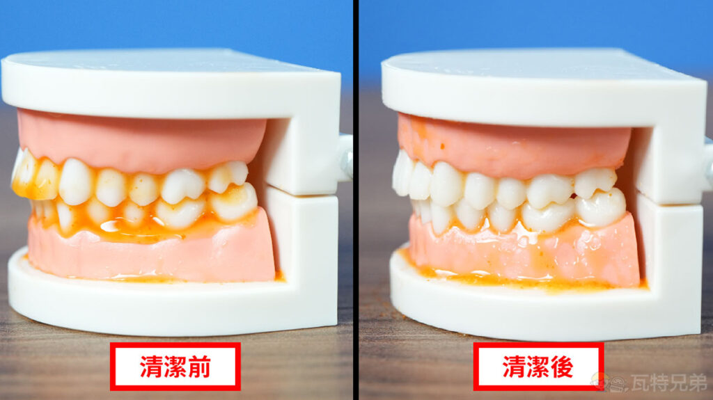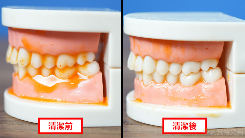 首先是電動牙刷最重要的「清潔能力」,瓦特會以它牌「競品牙刷」來進行比較,兩款電動牙刷皆會以「強效」(最大)的振動頻率對「沾滿辣椒醬」的牙齒模具進行清潔。