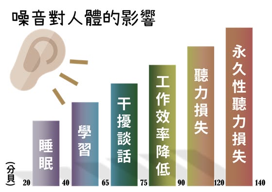 ▼ 高雄市政府環保局列出的各噪音階段與影響