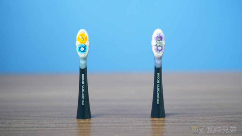 盒裝內附贈 2 個牙刷頭,分別為「藍色」與「紫色」刷頭,儘管兩款刷頭都定位為「全效緩震刷頭」,然而在細節設計上卻有很大的不同。