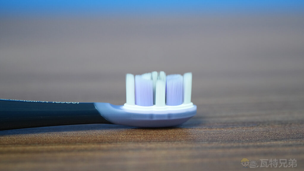 - 再來是「紫色刷頭」,其功能偏重「柔軟呵護」,由於錐形刷絲經磨尖+倒圓雙工序處理,刷毛受力均勻、輕柔彎曲,並同樣以 3D 包膠進行緩震,可有效降低牙齦刺激,相對更適合敏感牙齦使用。