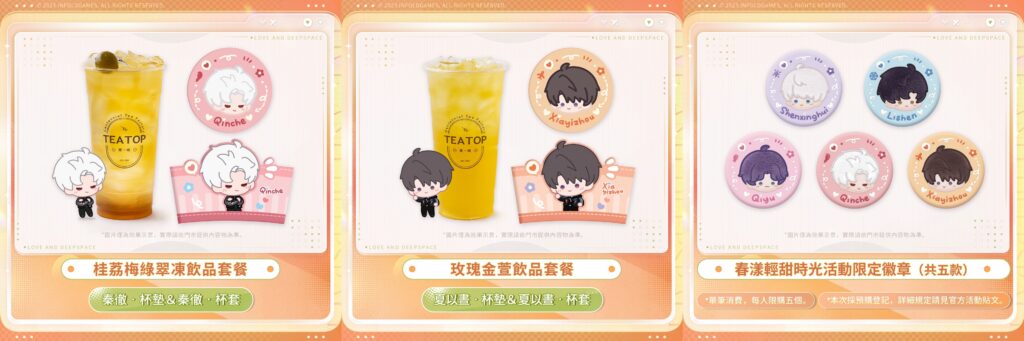 戀與深空聯名飲品套餐(飲品+杯墊+杯套),共五款套餐,每套NT$115元,每位獵人單筆消費限購買5套。