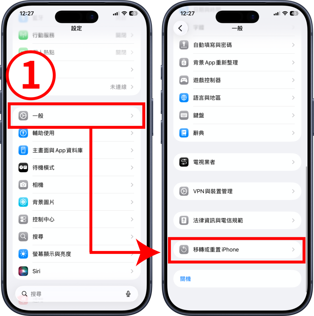 - 步驟(1)、開啟設定中的「一般」,點選「移轉或重置 iPhone」。