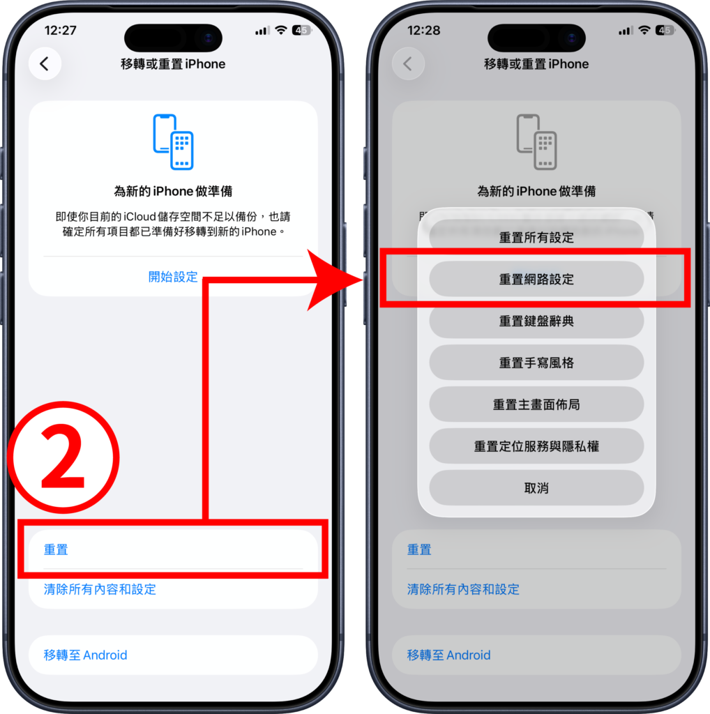 - 步驟(2)、選擇「重置」,再點選「重置網路設定」。