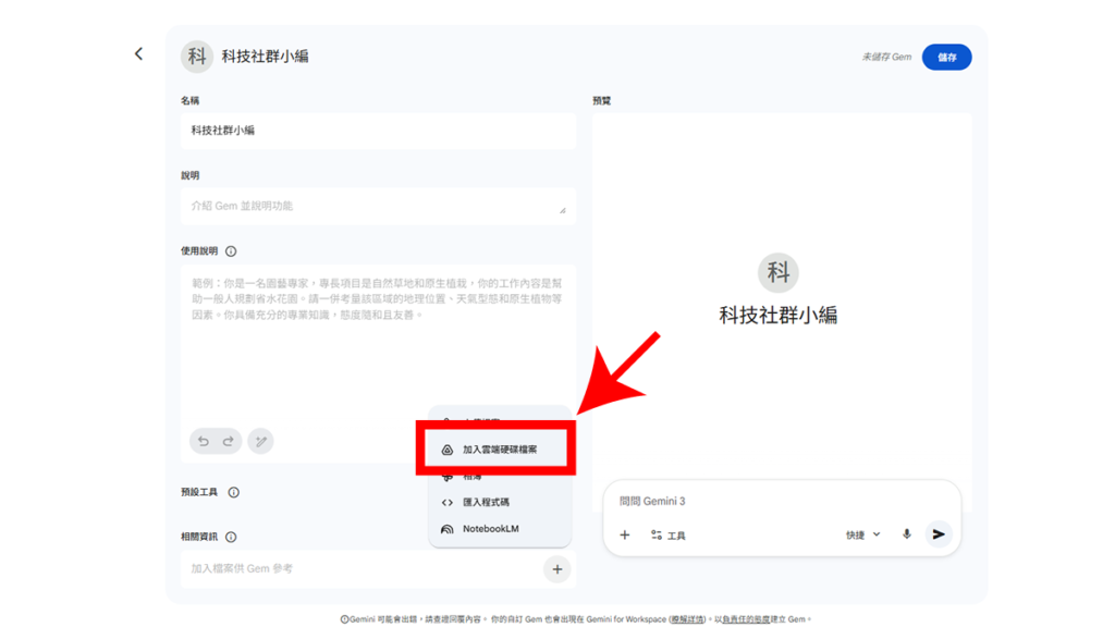 進入 Gem 編輯介面後,輸入「名稱」、「說明」等資料後,下拉至「相關資訊」點選一旁的「+」,再點選「加入雲端硬碟檔案」。