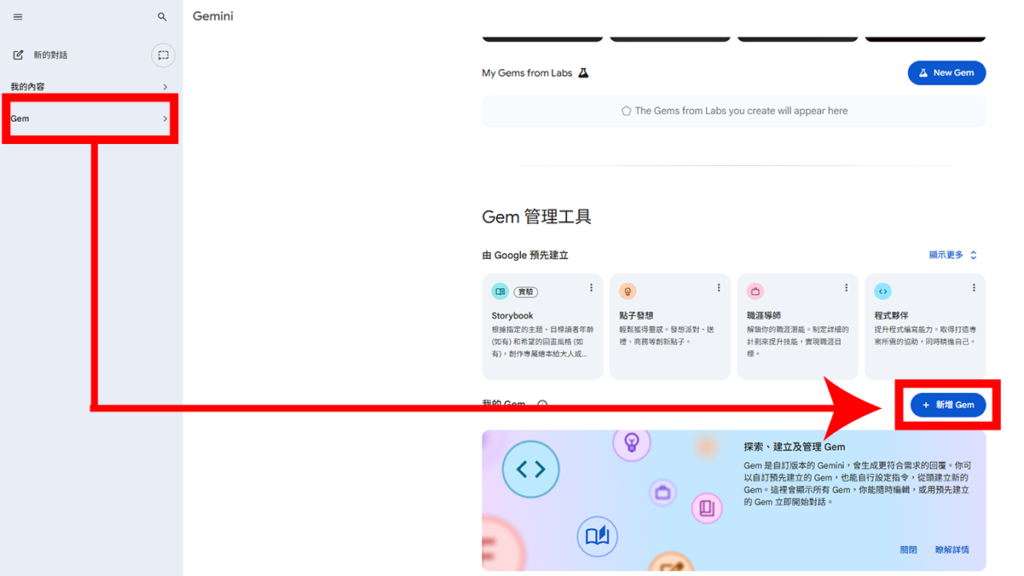 完成 Google 文件中的 Gem 設定後,即可進入 Gemini 介面,點選左側的「Gem」,再點選「新增 Gem」。