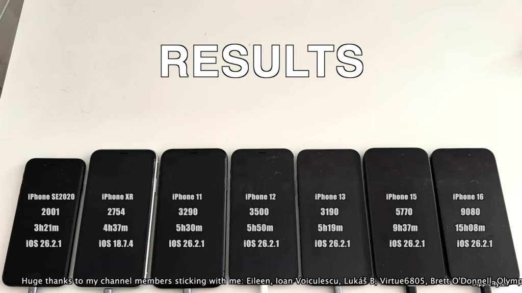 依據實測結果顯示, 6 款 iPhone 更新至 iOS 26.2 後持續運行至沒電,所花費時間分別為下: