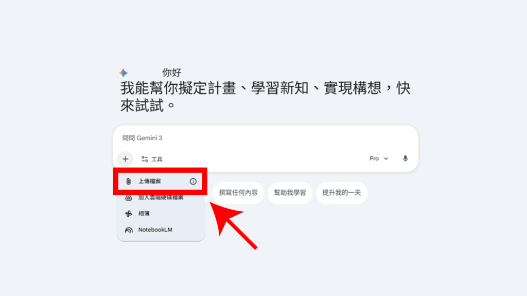 開啟 Gemini 頁面,點選「+」中的「上傳檔案」,將擷取好的圖片上傳。