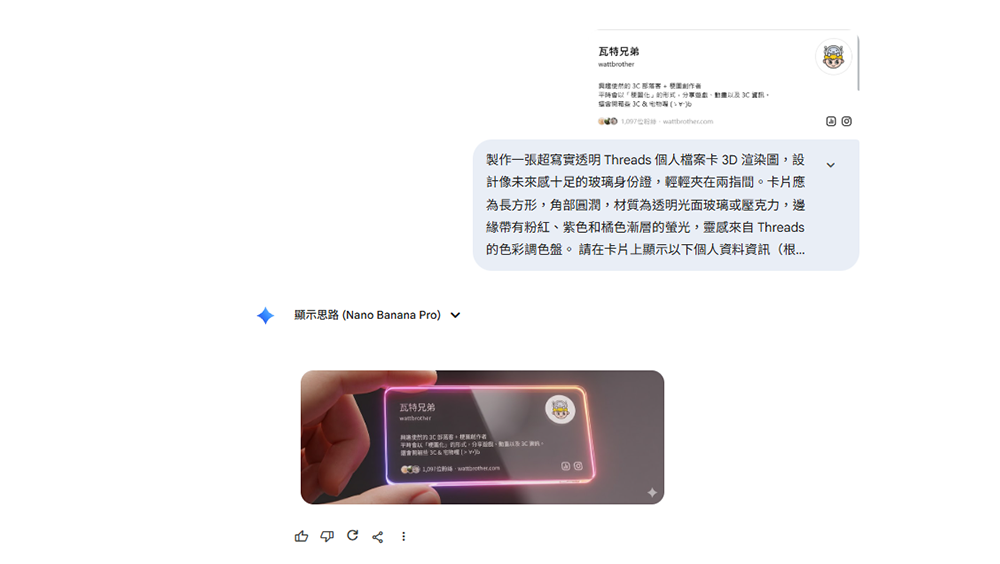 其實這是近日興起「Threads 名片」風潮,它的製作難度並不高,不需要專業的 3D 繪圖技術,只要打開 Gemini 等 AI 工具,輸入正確的提示詞,就可以獲得專屬的個人名片喔!