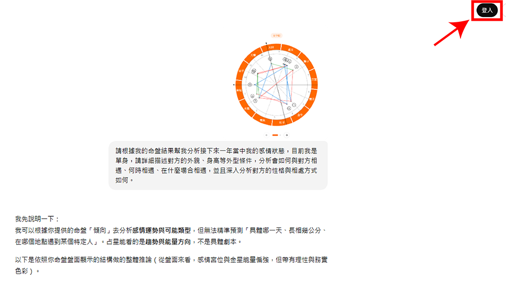 - 感情:「請根據我的命盤結果幫我分析接下來一年當中我的感情狀態,目前我是單身,請詳細描述對方的外貌、身高等外型條件,分析會如何與對方相遇、何時相遇、在什麼場合相遇,並且深入分析對方的性格與相處方式如何。」