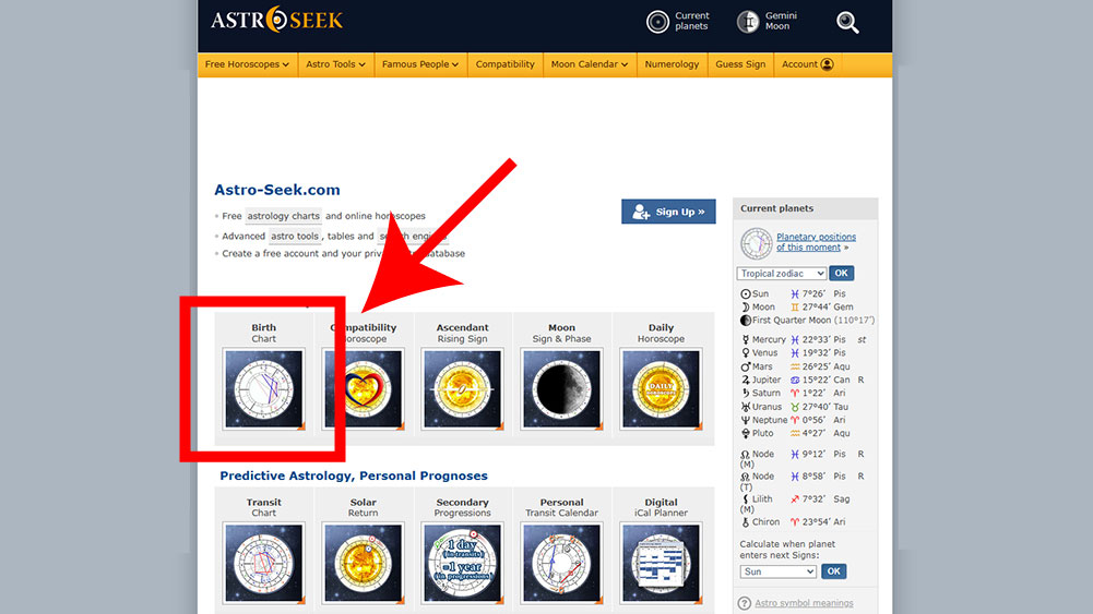 - 步驟(1)、前往 Astro-Seek,點選「Birth Chart」(本命盤)。