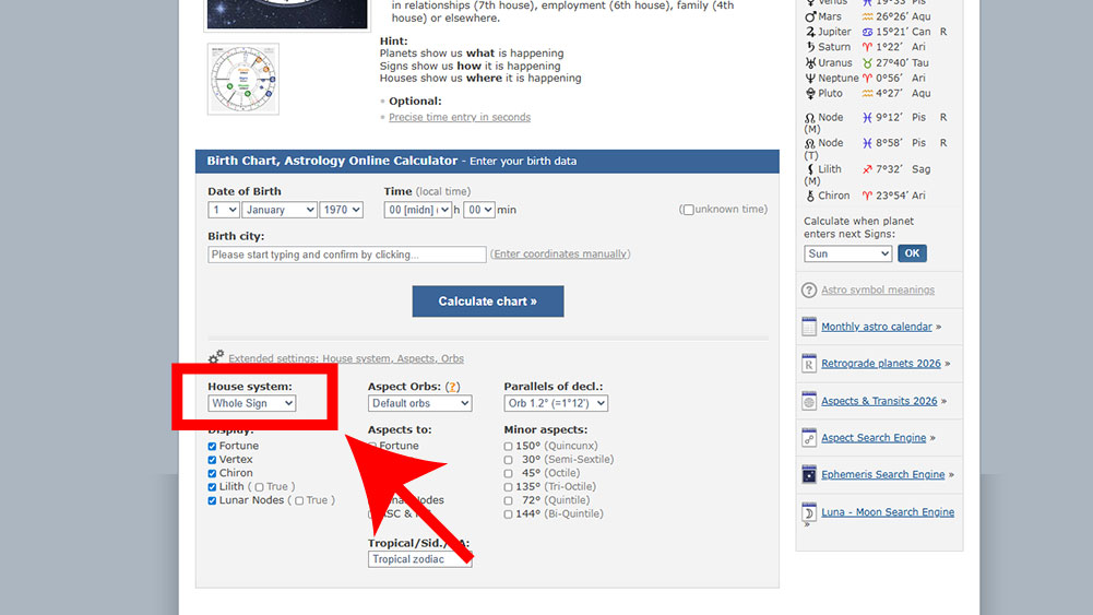 - 步驟(2)、先打開下方的「Extended settings」(有標示齒輪圖示),從中找到「House system」,將其設定為 「Whole Sign」(整宮制)。