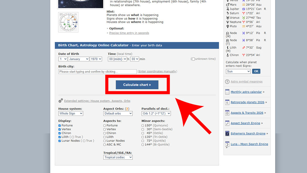 在查詢自己的星盤之前,建議你可以先準備好出生年月日、出生地點等個人資料,接下來就可以使用 Astro-Seek 來進行查詢,該網站為國內外占星迷愛用的網站之一,由於免費、免註冊帳號,查詢門檻低、較不擔心個人資料外流。