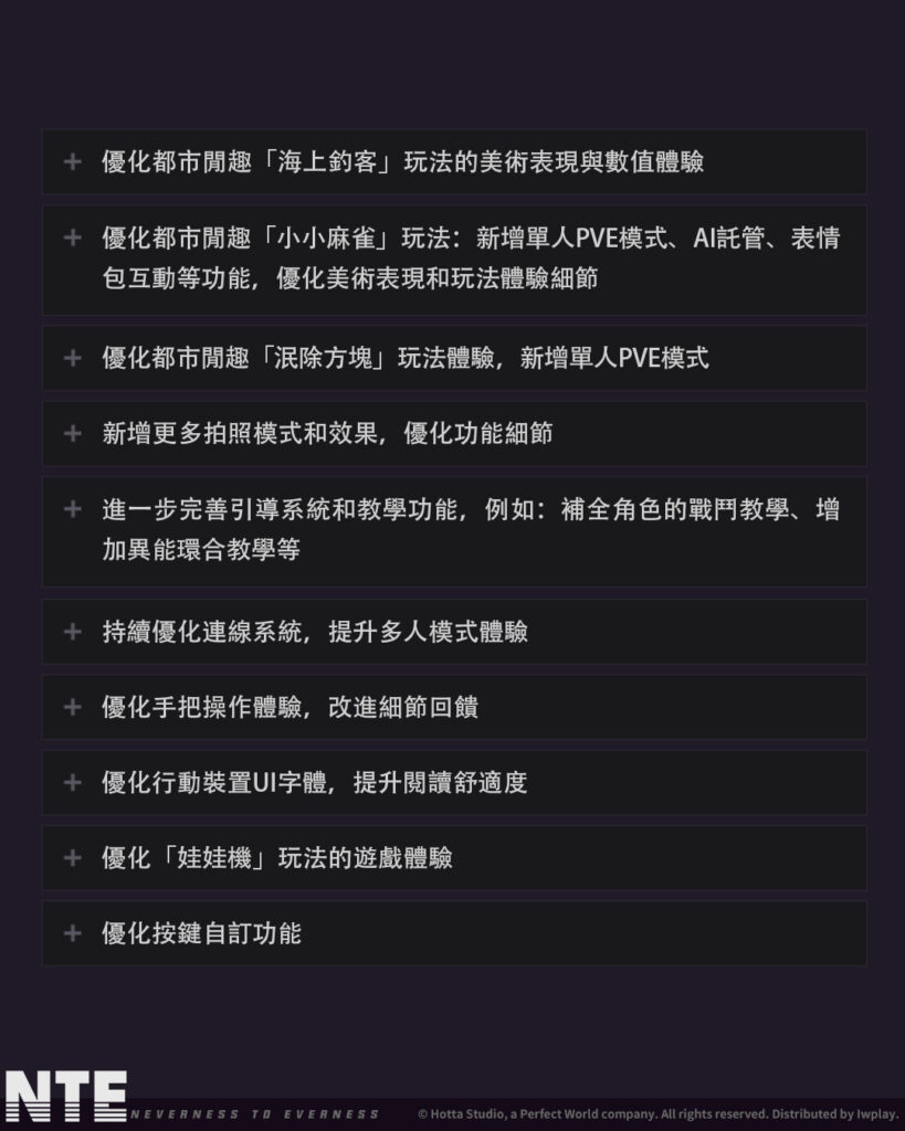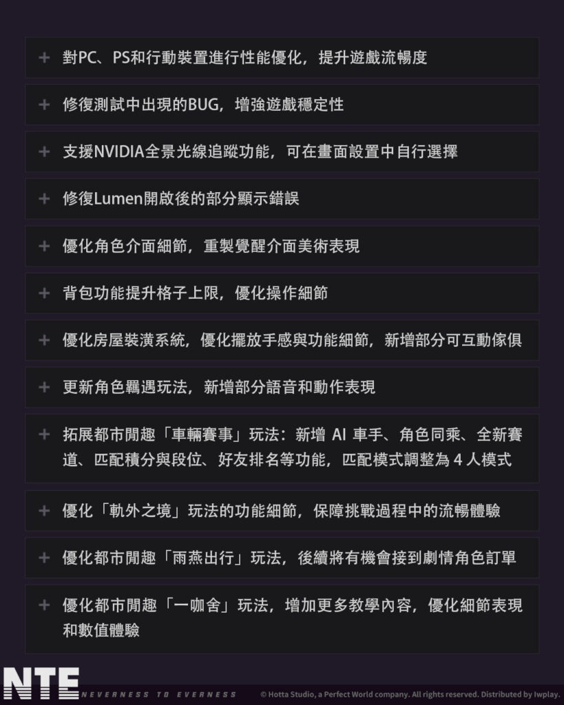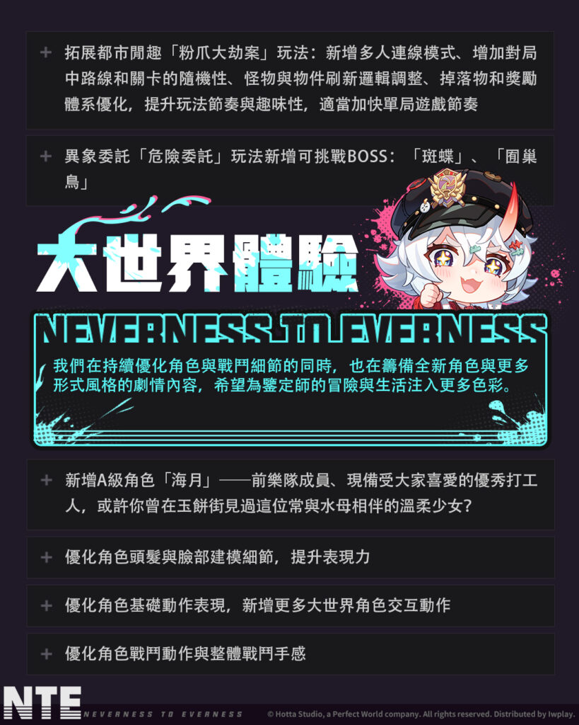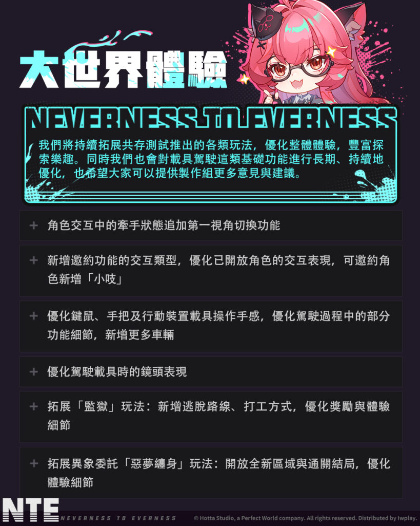 在「共存測試」期間,《異環》運營團隊收到了鑒定師大量且真情的支持與回饋,在迎接4月29日上市來臨之際,團隊將依據測試期間的建議持續進行整體體驗優化,包含修復已知問題、提升穩定度與操作流暢性,並同步強化角色表現與玩法內容。