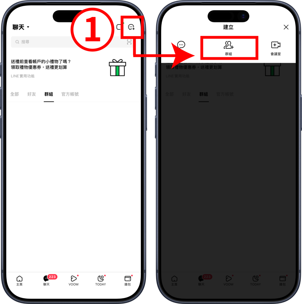 - 步驟(1)、開啟 LINE App,點選右上角的「建立」,再選「群組」。