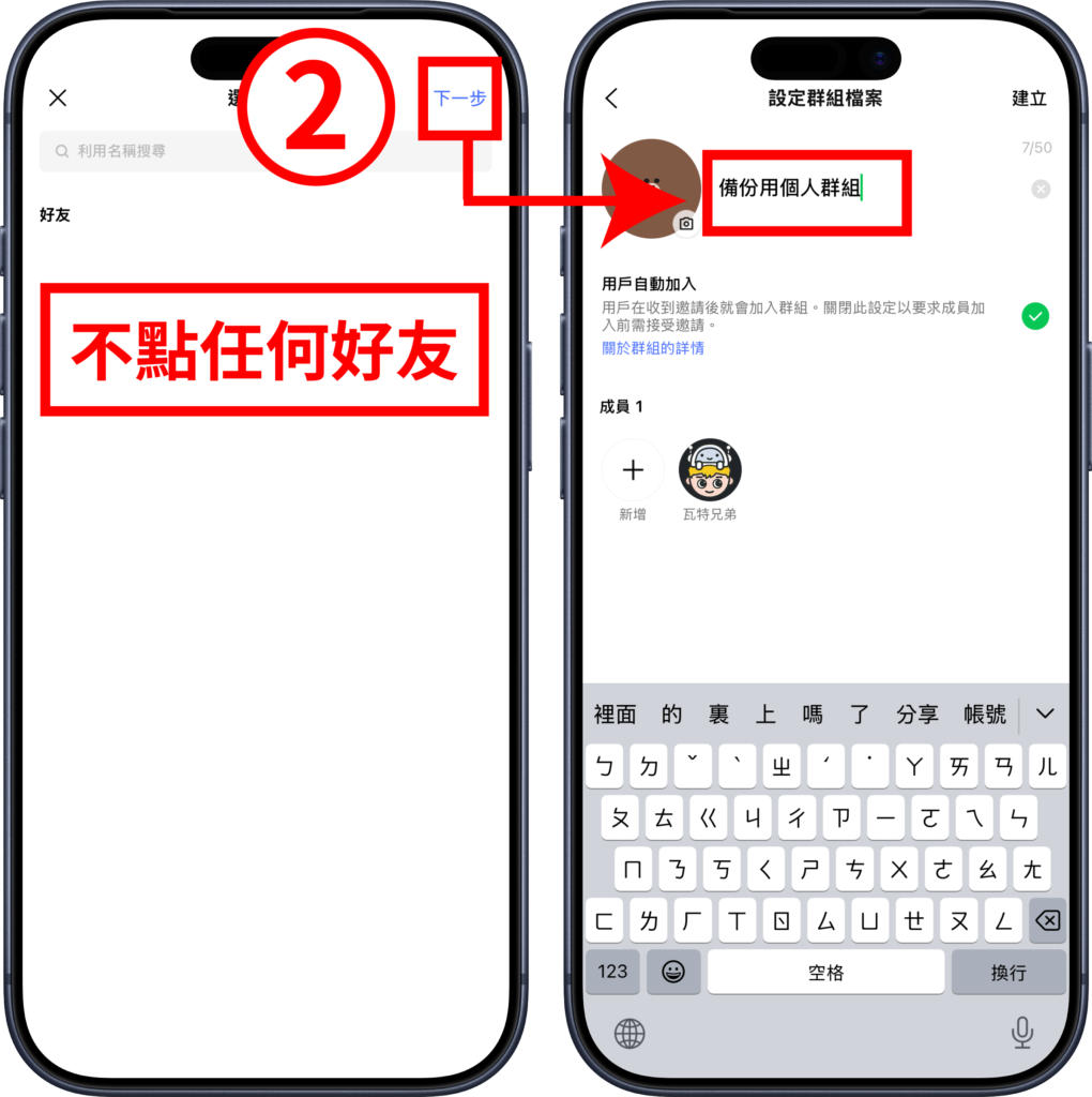 - 步驟(2)、不選擇任何好友,直接進入「下一步」,並設立「群組名稱」(個人用)。