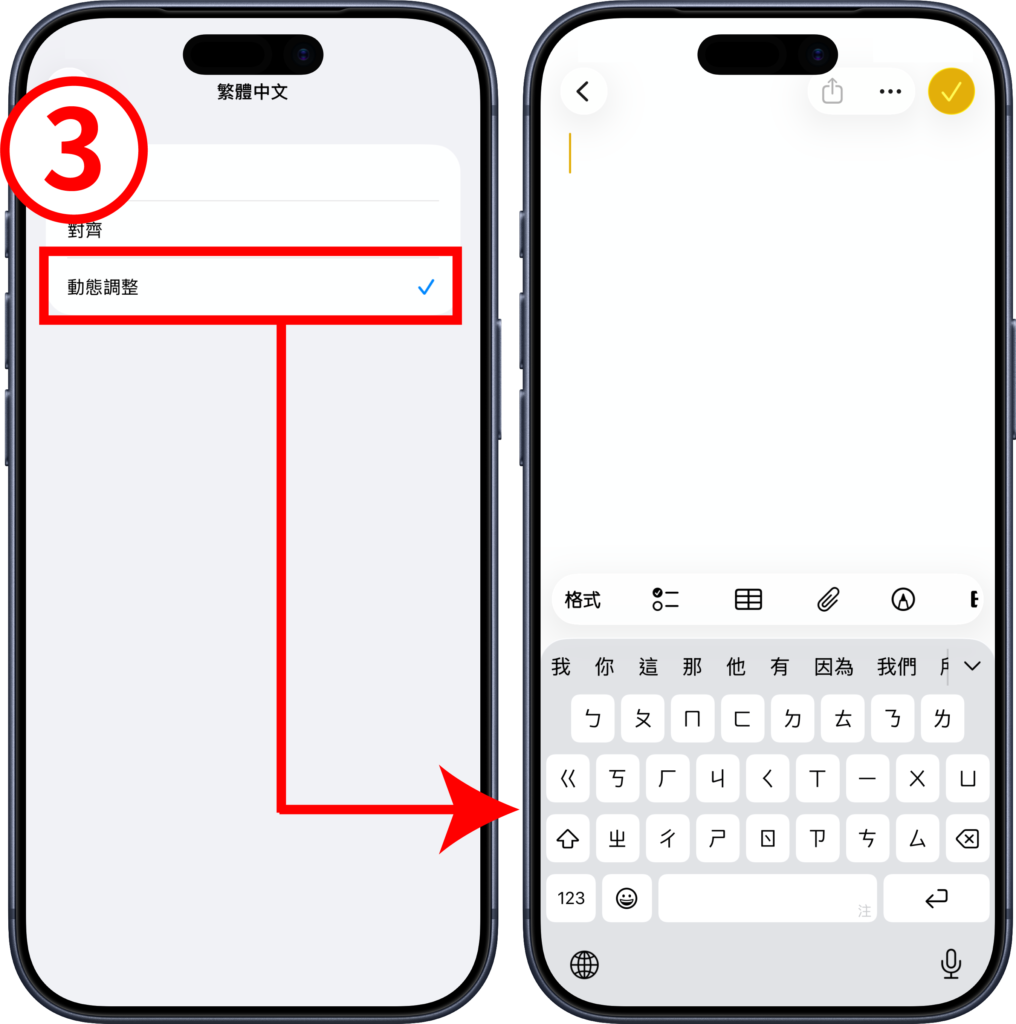 - 步驟(3)、選擇「動態調整」,即可切換鍵盤。