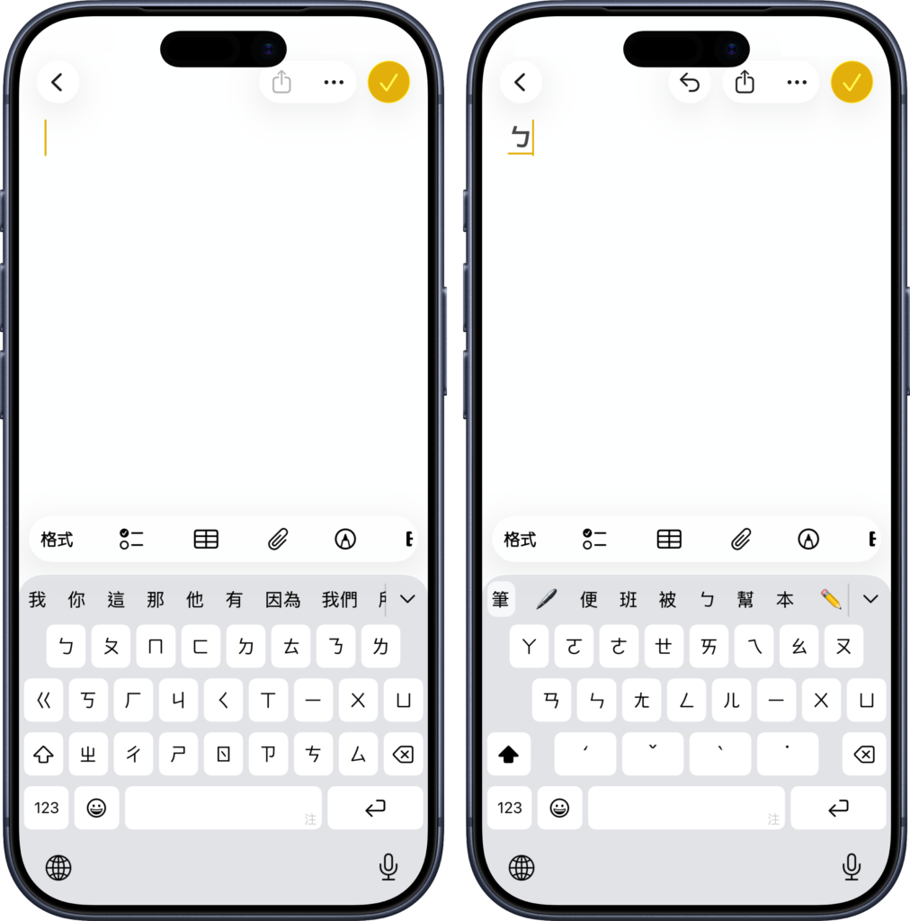 所謂的「iPhone 動態鍵盤」,是 iOS 內建的一種鍵盤形式,與我們現在常見的「標準鍵盤」不同,並不會將 37 個注音符號與聲調全都納入同一畫面中,而是會依據當前的「輸入階段」,分批呈現當前會「可能」用到的符號,藉此減少畫面中呈現的按鍵量,增大各按鍵大小。