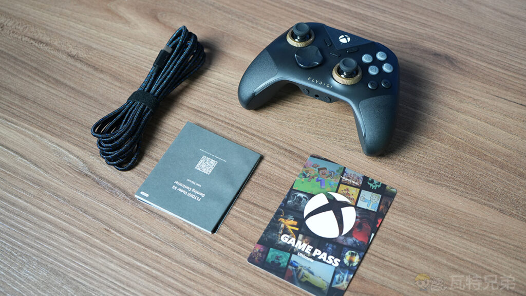 取出所有內容物後,扣除「黑武士 5S 」(手把本體)外,其餘附件包含:「數據線」、「Xbox Game Pass」以及「說明書附件」。