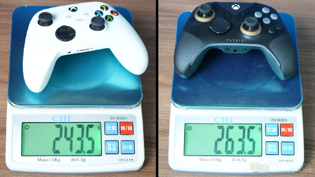 重量方面,「黑武士 5S」所測得為 263.5g,相較於原廠 Xbox 手把的 243.5g,其重量多了約 20g,稍微重了一點,但也相對更有份量感,玩起來更加紮實。