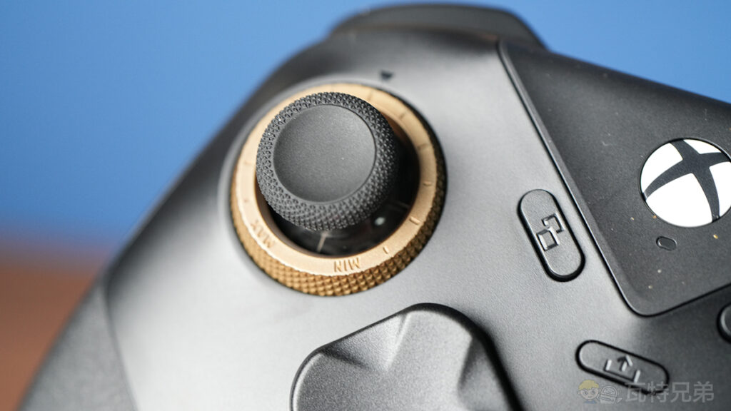 「力調節槓桿搖桿」主要指搖桿外圈的「金色」旋鈕處,該功能可透過左右旋轉來調整搖桿的輕重程度,可調節的力度範圍介於 40gf~100gf 之間,其中往逆時針轉動,搖桿會更輕更絲滑;往順時針轉動,搖桿則更重更紮實。