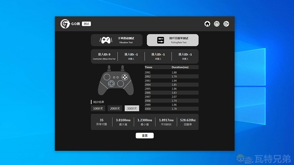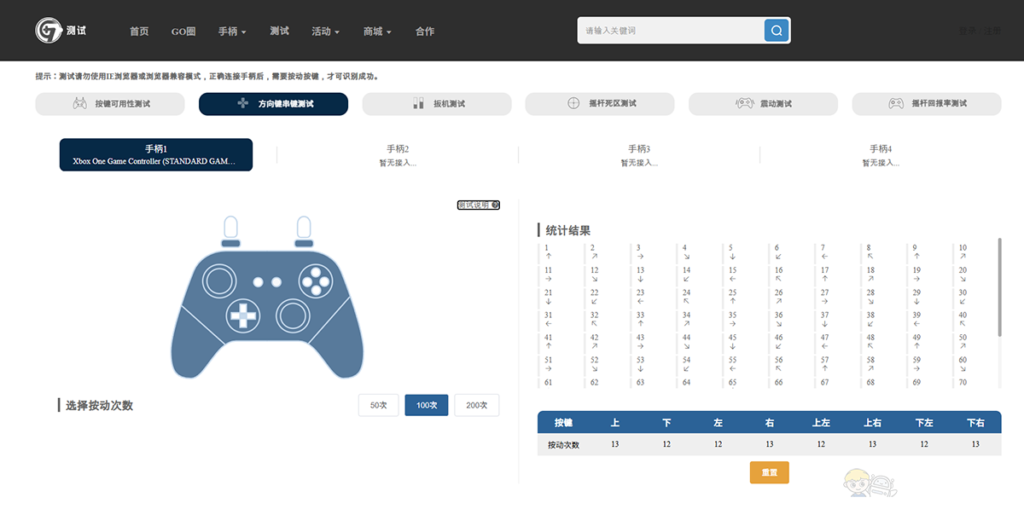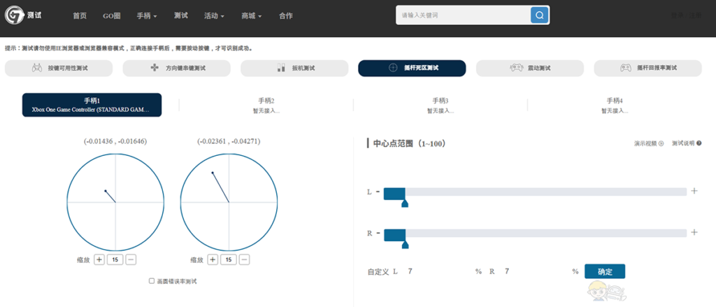 以下測試中,瓦特將會以專業網站「Gamepad Tester 」與「Go 柄網」來進行相當搖桿測試,包含「精準度」、「中心點死區」、「手把健康狀況」等 4 項。