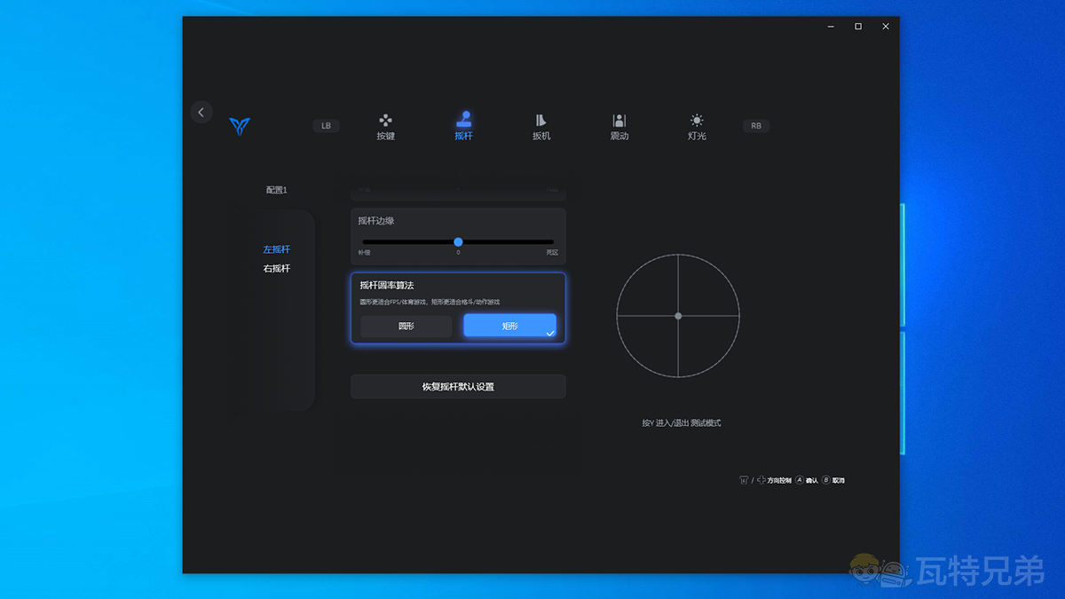 在 Gamepad Tester 的畫圓錯誤率測試,主要用來檢測搖桿的健康狀態,其正常結果有 2 類型,第一種是接近方型的橢圓形、另一種則是正圓形,其中「黑武士 5S」可透過外部設定,自由調整上述兩種狀況,前者適合動作類遊戲、後者適合射擊類遊戲。