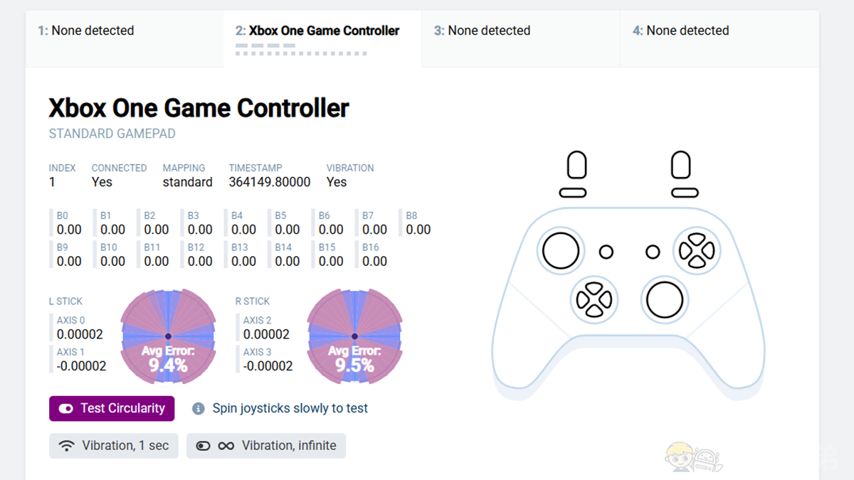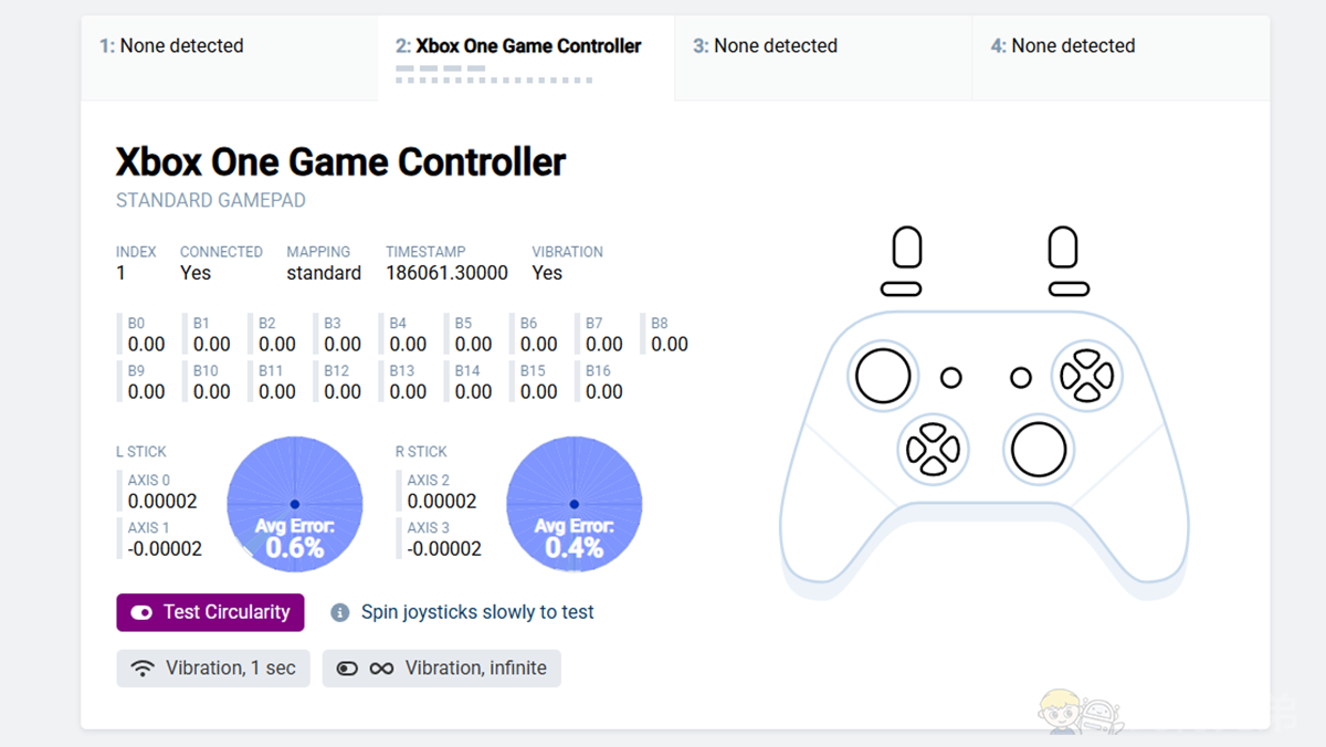 - 以下瓦特用 Gamepad Tester 進行基本的精準度檢查,從下列實測影片可看出,「黑武士 5S」搖桿推移的路徑與 Gamepad Tester 檢測結果一致,各方位推移皆正常,放開後搖桿也可以正常回中;至於搖桿放開後, Gamepad Tester 依舊會顯示極小的數字,數值約為 ±0.00XXX ,這屬於正常現象,而非飄移或回中異常。