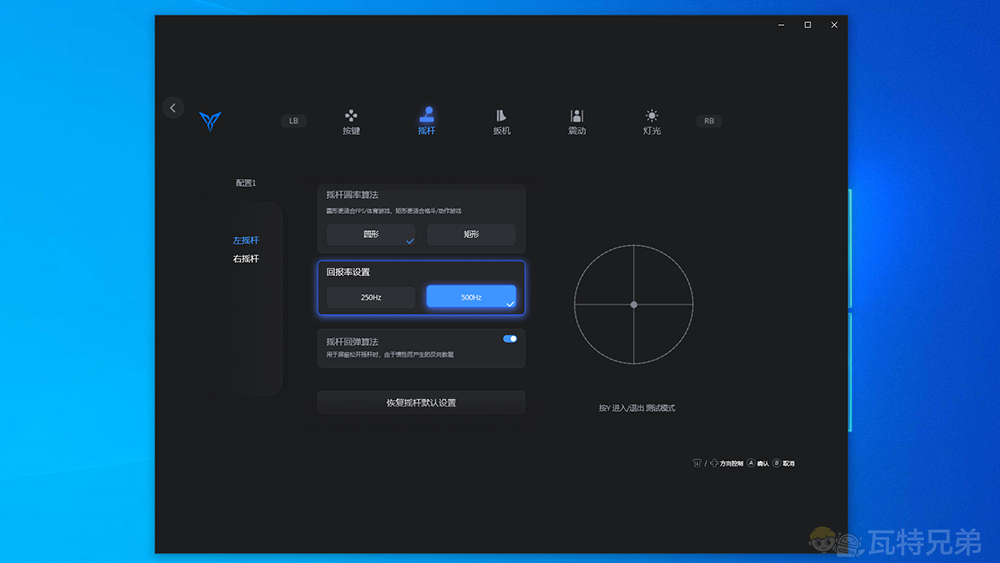 除了連線簡單外,有線連接還有「連線穩定」、「反應更快」等優勢,這點可以從「搖桿回報率」檢測。所謂的「搖桿回報率」是一種用來辨識手把延遲程度的標準,其數字越大,代表手把發送訊號越快、延遲時間也越短,而「黑武士 5S」有「250hz」與「500hz」兩種回報率可調整,可前往外部應用程式進行設定。