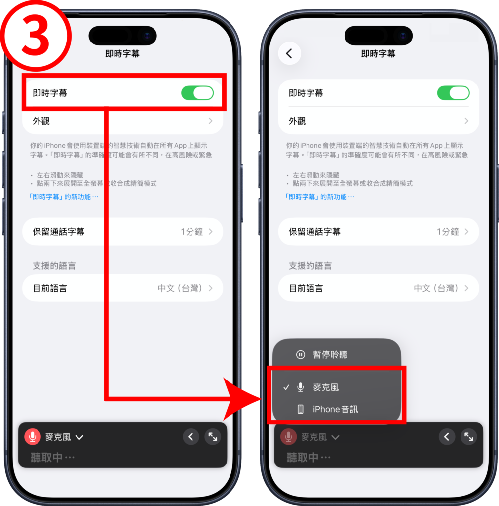 - 步驟(3)、開啟「即時字幕」功能,再選擇「麥克風」或「iPhone 音訊」,即可讓 iPhone 顯示即時字幕。