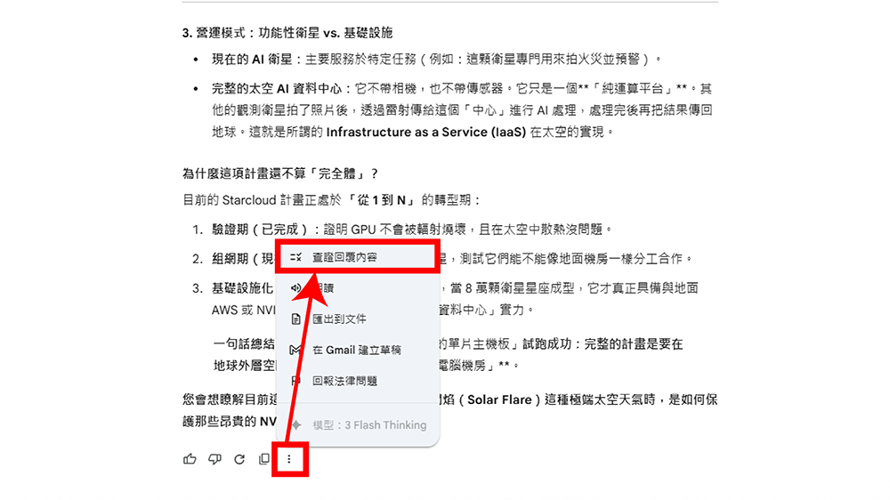 ▼ 從「…」中找到 Gemini 的查證回覆功能