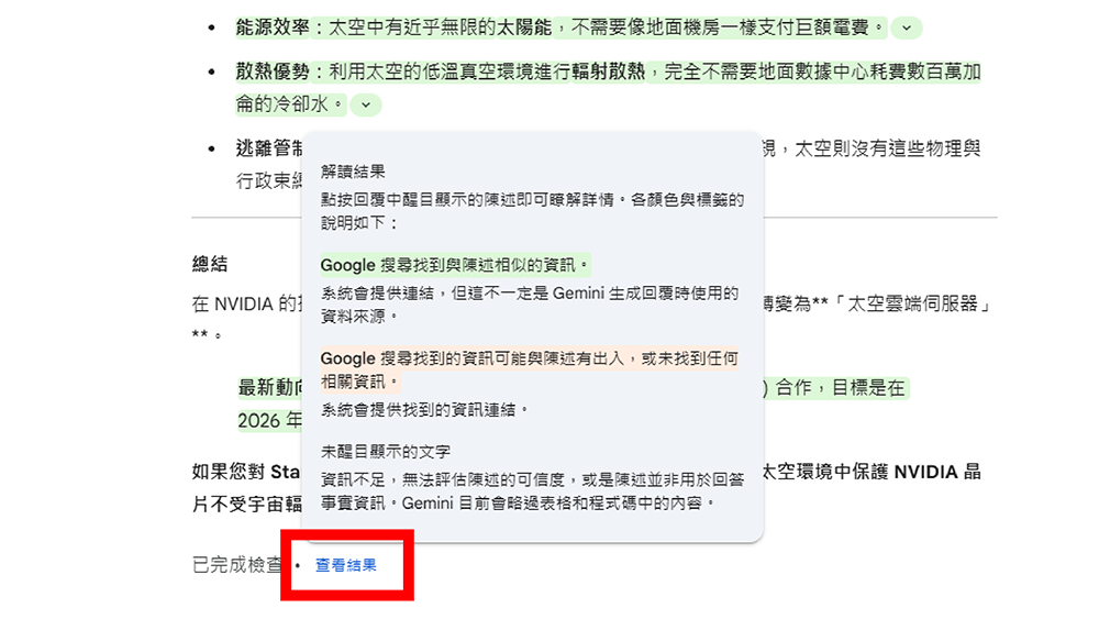 而 Gemini 查證完畢後,會在回覆內容當中標示「綠色」或「粉膚色」以及「無顏色」三種結果,這三種結果分別代表著不同意思: