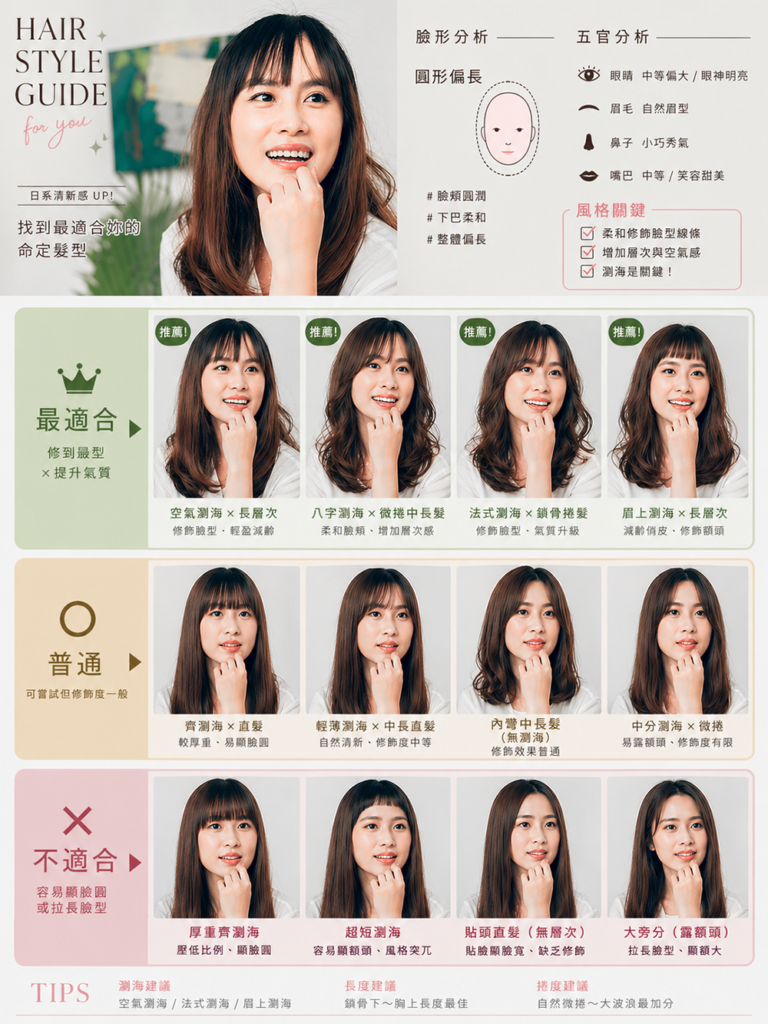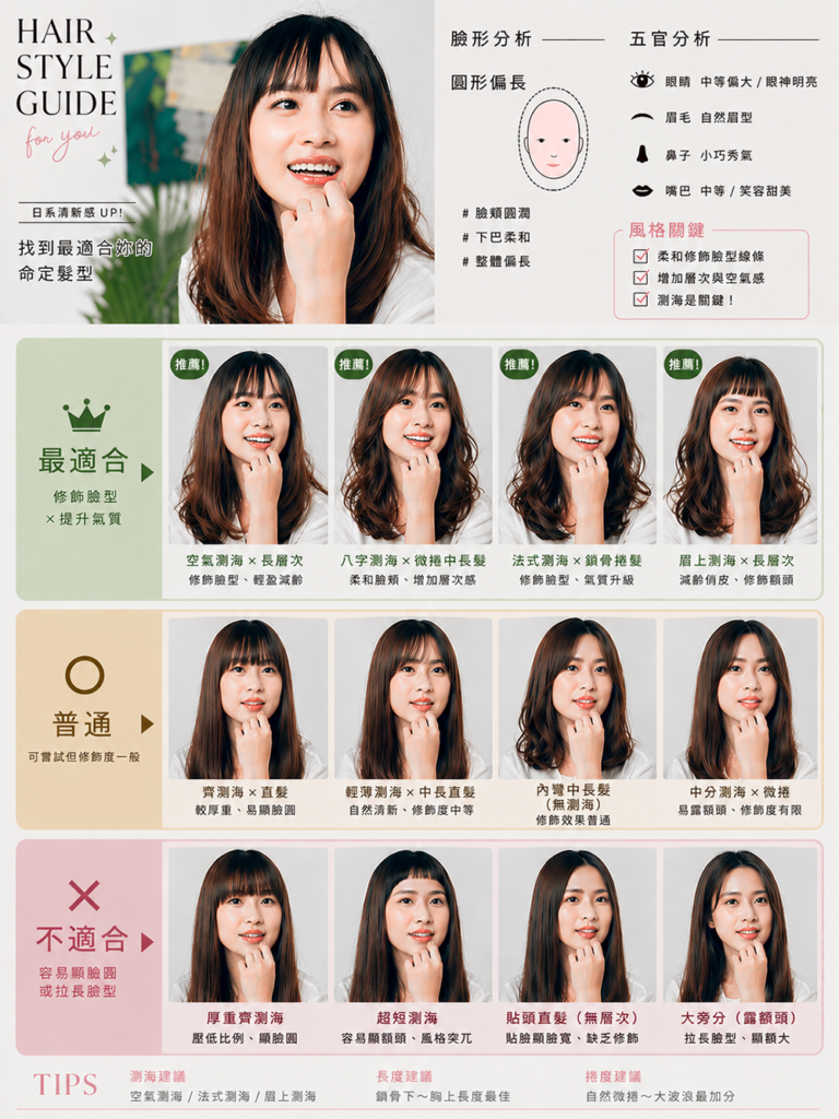 - 髮型分析圖卡指令:「請根據我上傳的照片人物,分析她的臉形與五官,保留人物的五官真實度以及辨識度,不可修改人物五官與臉型、不進行修圖,分析出適合她的髮型,請以「最適合」、「普通」、「不適合」三種類別進行分類,並且以日系時尚雜誌風格進行排版與美編,以圖片為主要呈現方式,文字盡量減短,讓人能夠一眼快速的找到重點,每個髮型生成必須與說明文字相符,禁止僅改變文字,圖片未跟著修改。」
